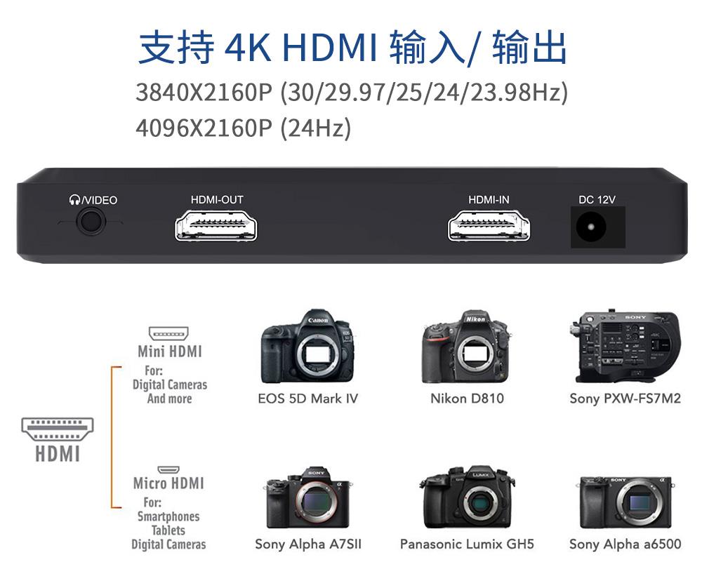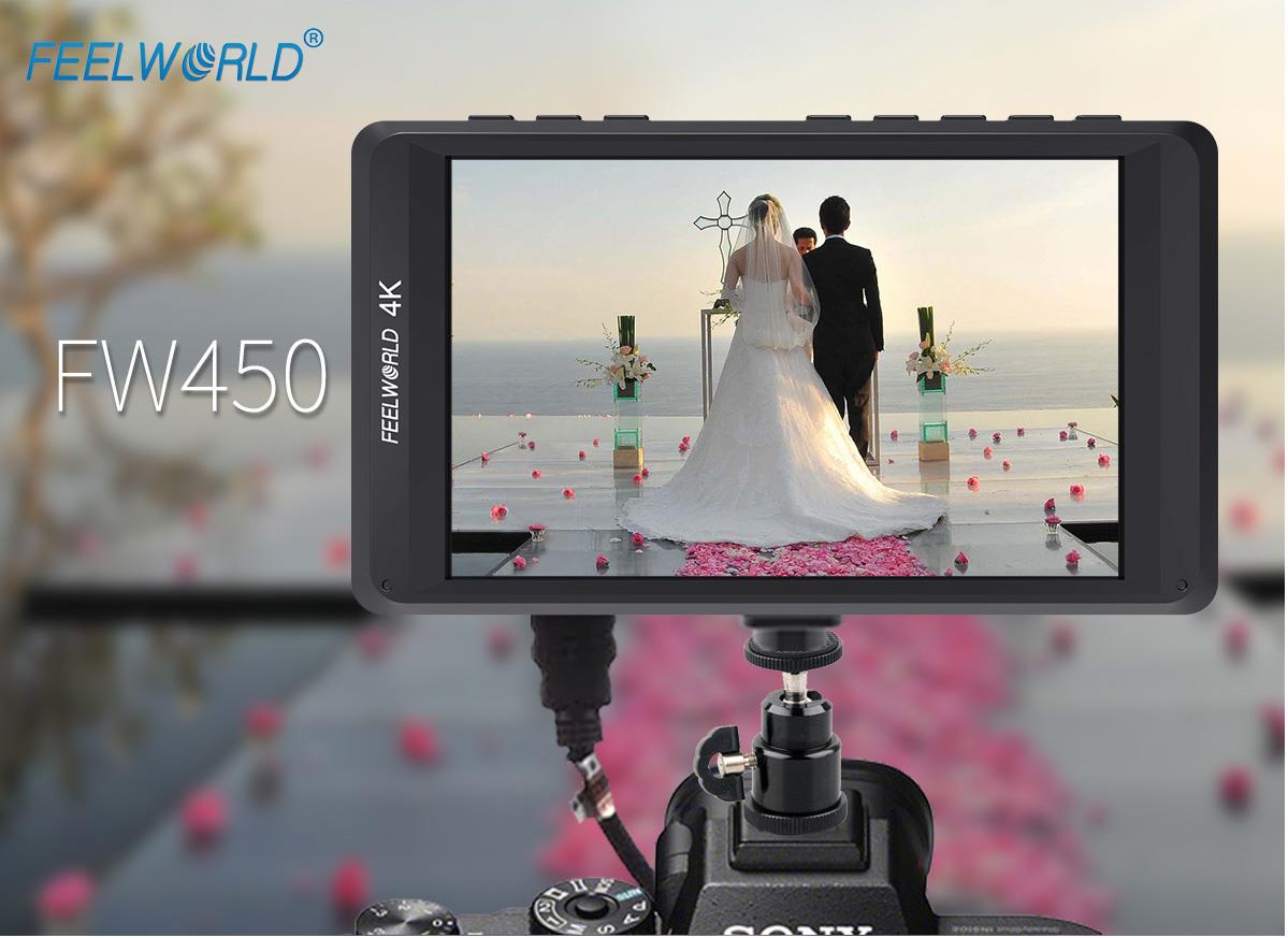 FEELWORLD FW450是HDMI 监视器,支援4K HDMI输入输出, 适合连接各种型号的单反和微单进行监看,此外,还配备3.5MM耳机输出兼容VIDEO输入插孔,让您可以连接VIDEO输入信号,也可以通过3.5mm立体声耳机插口来监听音频。