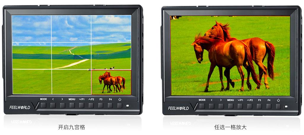 防止播放时扫描溢出, 导致不该被切的画面而被切掉。FEELWORLD监视器设有多种画幅安全框标记(80%, 85%, 90%, 93%, 96%, 2.35:1) 和拍摄标记线和十字中心线。保障稳定可靠的拍摄高效进行,满足多样化的后期裁剪需求。用户可以根据不同拍摄背景色调灵活选择标记线颜色(红色, 绿色, 蓝色, 白色, 黑色)