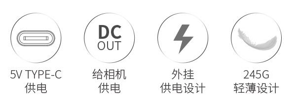 * DC电源输出接口,可以连接额外选配的假电池电源线给单反相机或者微单相机供电,以延长相机拍摄时间