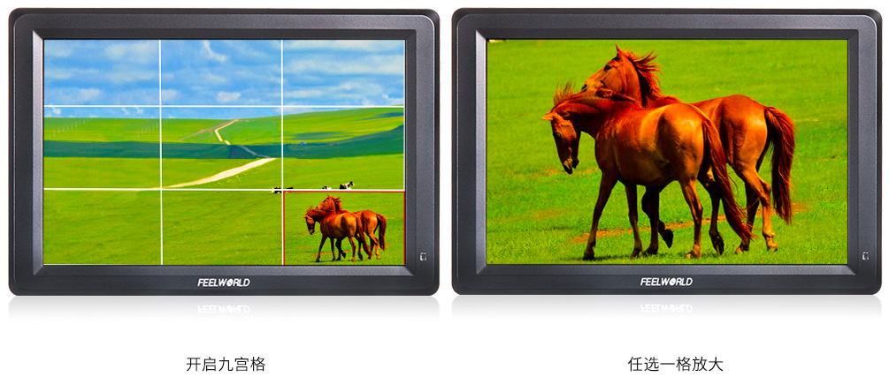 防止播放时扫描溢出, 导致不该被切的画面而被切掉。FEELWORLD监视器设有多种画幅安全框标记(80%, 85%, 90%, 93%, 96%, 2.35:1) 和拍摄标记线和十字中心线。保障稳定可靠的拍摄高效进行,满足多样化的后期裁剪需求。用户可以根据不同拍摄背景色调灵活选择标记线颜色(红色, 绿色, 蓝色, 白色, 黑色)