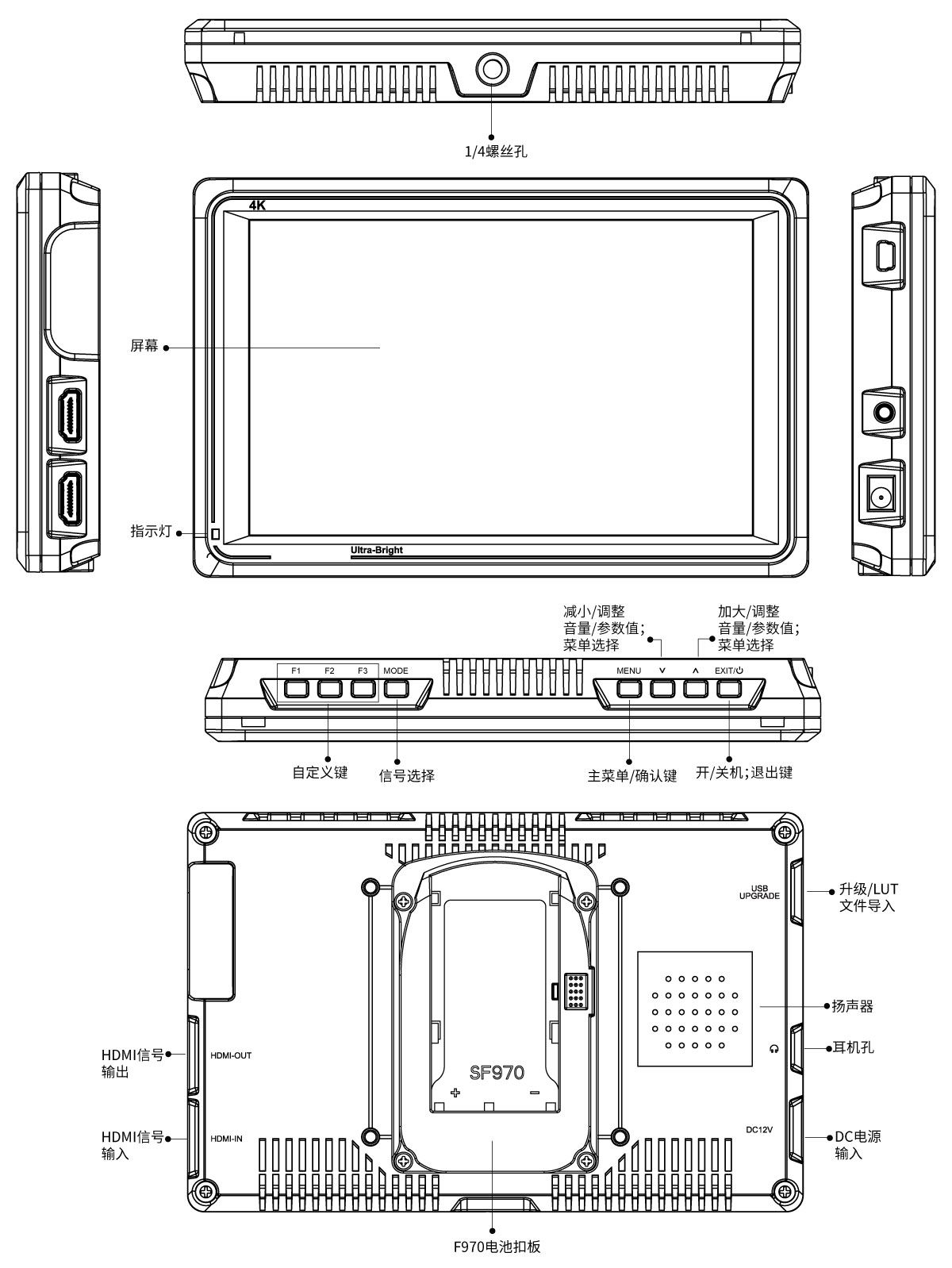 | 单机重量 | 340g/370g (含F970电池扣板) |