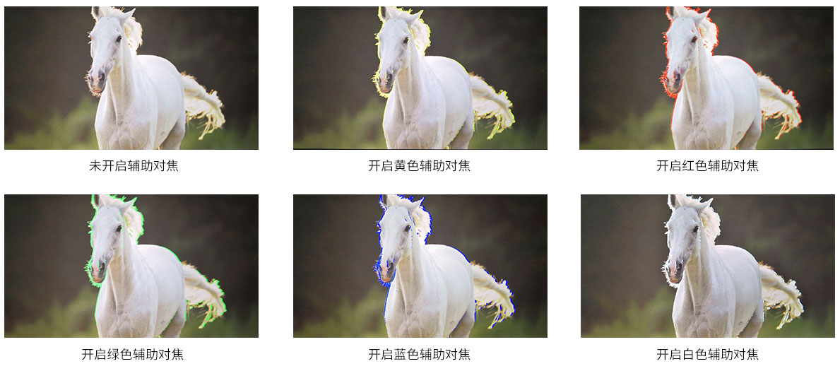 画面中锐利的边缘可以用黄色、红色、绿色、蓝色、白色标示出来,对焦水平有1~10级可以调整,便于摄影师清晰的辨认是否聚焦准确,摄影师可根据被摄物体的不同色调选择聚焦颜色。辅助对焦在摄像机预览、录制和回放皆可实时操作,无操作延时。