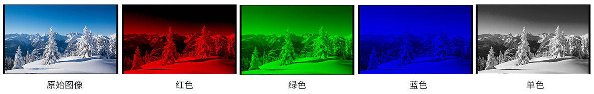 单色显示用于辅助调整摄像机色彩设置。在单色显示模式下,用户可以切换用红色、绿色、蓝色或者灰色来驱动像素点,在此模式下可以更快更准确的调整画面的色调饱和度。