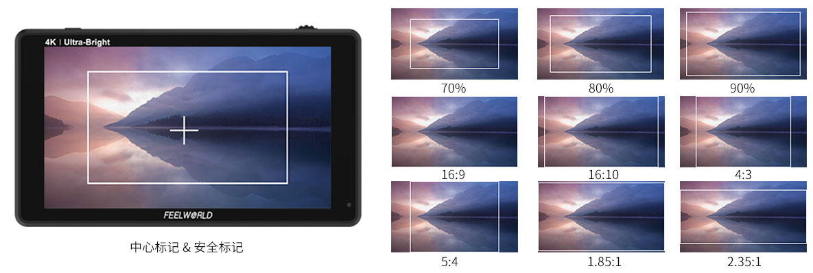 防止播放时扫描溢出,导致不该被切的画面而被切掉。监视器设有多种画幅安全框标记(70%, 80%, 90%, 16:9, 16:10, 4:3, 5:4, 1.85:1, 2.35:1) 和拍摄标记线和十字中心线。保障稳定可靠的拍摄高效进行,满足多样化的后期裁剪需求。用户可以根据不同拍摄背景色调灵活选择标记线颜色(黄色, 红色, 绿色, 蓝色, 白色, 黑色)。