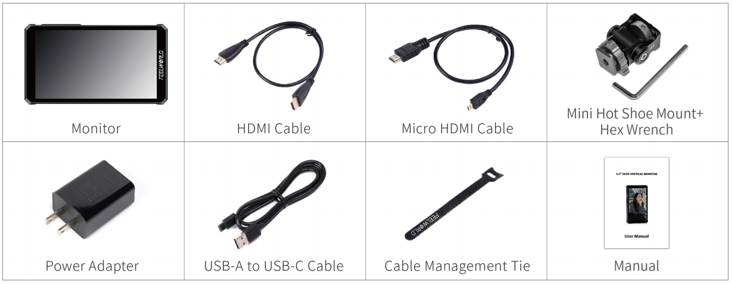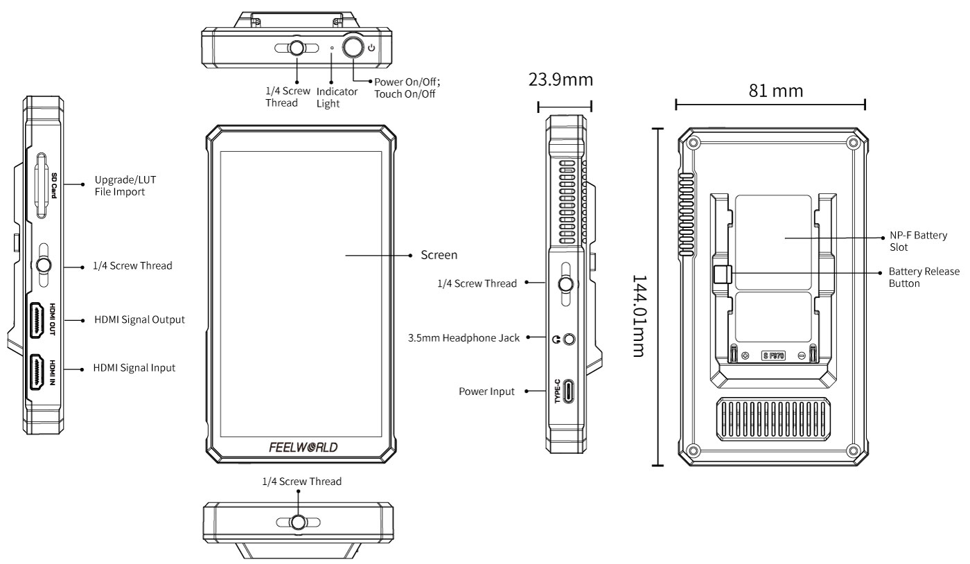 The monitor is equipped with 4 standard 1/4mounting threads (top, bottom, right side), you can easily mount it on the camera or other types of equipment with a magic arm, bracket, etc.. Meet the different monitoring for photographer or director.