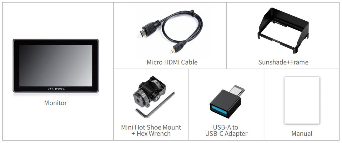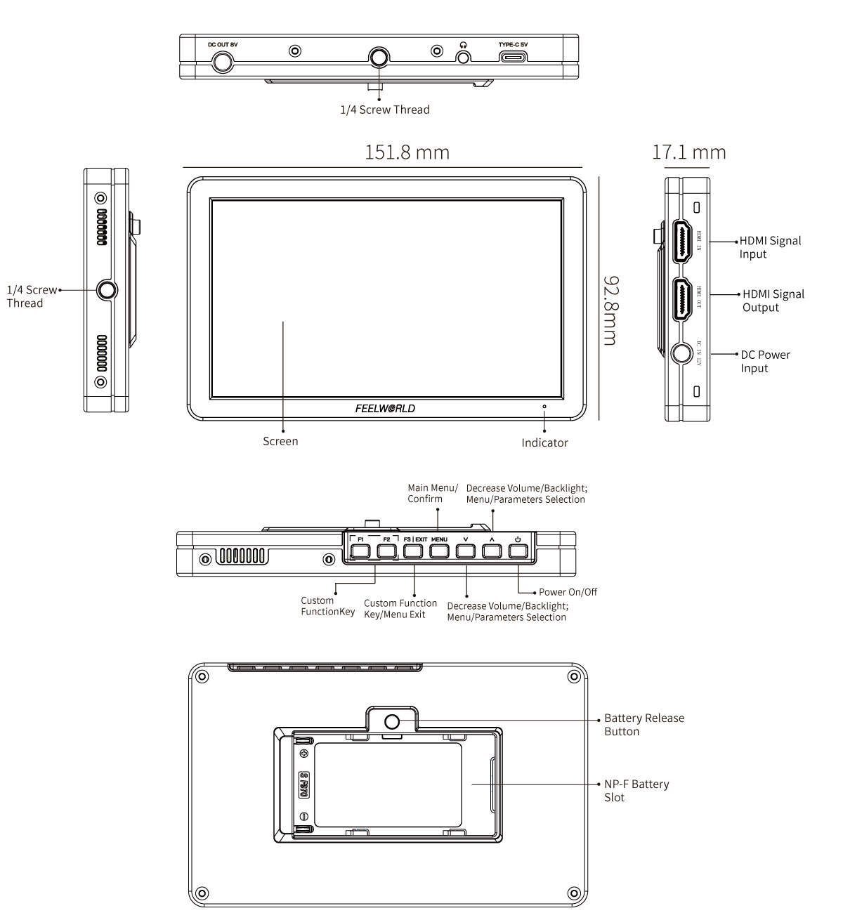 You can connect to DC power input to get continuous power (suitable for use 1A power adapter,DC 5.5*2.1mm power plug) or install NP-F series battery on the NP-F battery slot for mobile application. Install one F750 battery (4400mah) last for about 3.5 hours. The monitor also provides a 5V Type-C input, which can be powered by 5V/2A or more than 2A mobile phone charger or power bank.