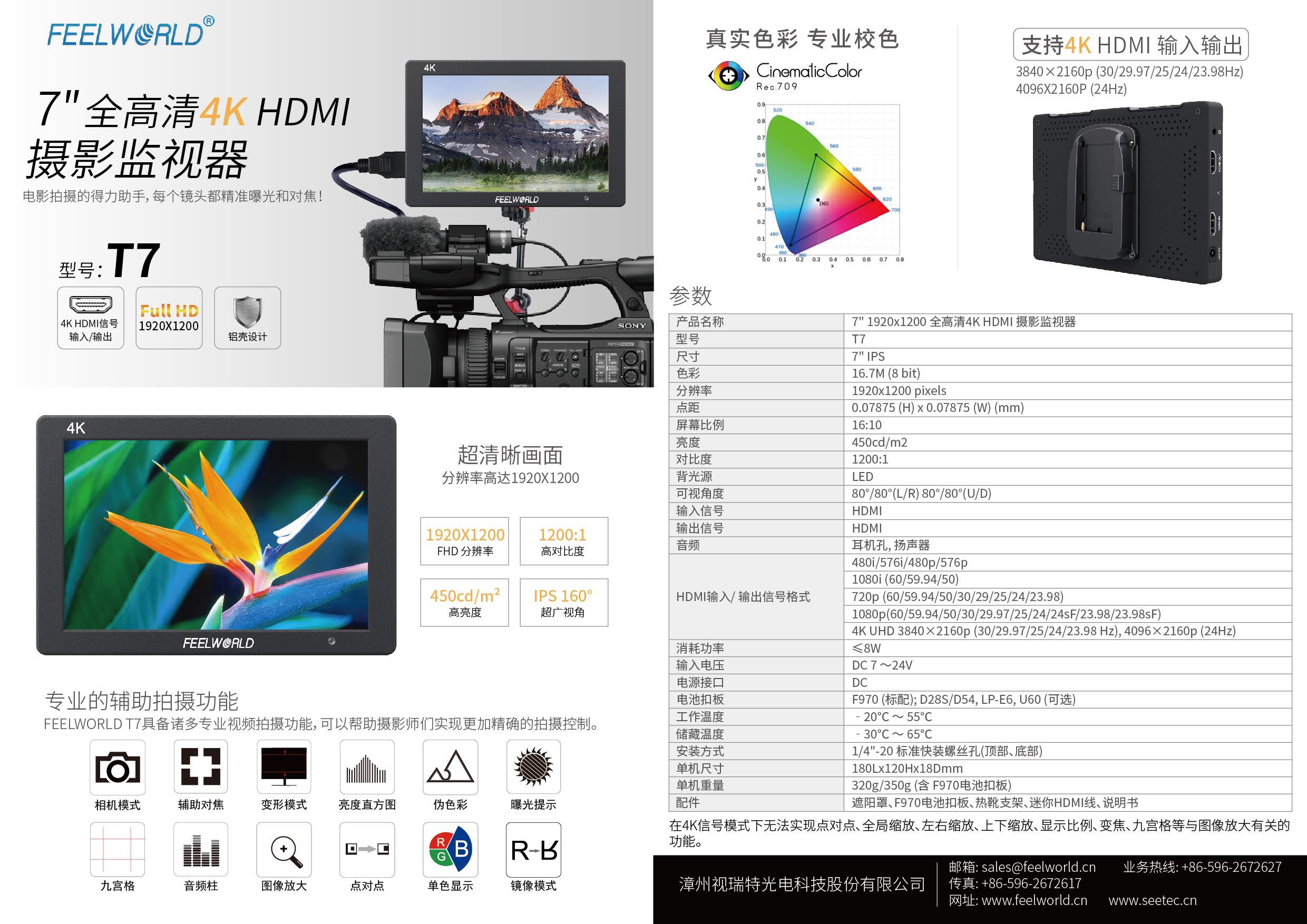 FEELWORLD T7 4K监视器,采用了“黄金尺寸”7寸的全高清大屏,分辨率1920X1200,像素密度高达323PPI,让极细微的色彩变化都能体现出来,让您可以轻松掌握每个细节的点点滴滴,无论在室内或者室外,图像依然清晰、层次感丰富,带给您理想的视觉体验。