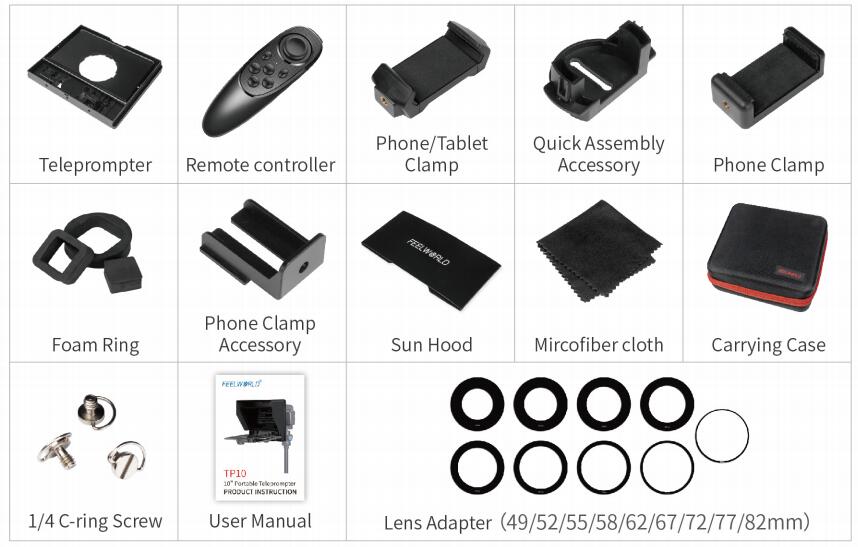 The TP10 comes with eight standard lens adapter rings: 49/52/55/58/62/67/72/77/82mm. You can choose the one of them for your camera lens, prompting connection of the camera and teleprompter tightly.