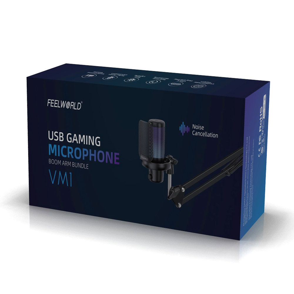 FEELWORLD VM1 USB microphone is specifically designed for gamers, One-key noise-cancellation technology eliminates unwanted background sounds, enabling you to communicate clearly and efficiently with your fellow gamers. Multiple RGB lighting effects provide an exciting atmosphere that can help you fully immerse yourself in your gameplay. The one-tap mute, microphone volume control, and real-time monitoring features will enhancement to your overall gaming experience.Ideal for game streaming, chatting and podcasting.