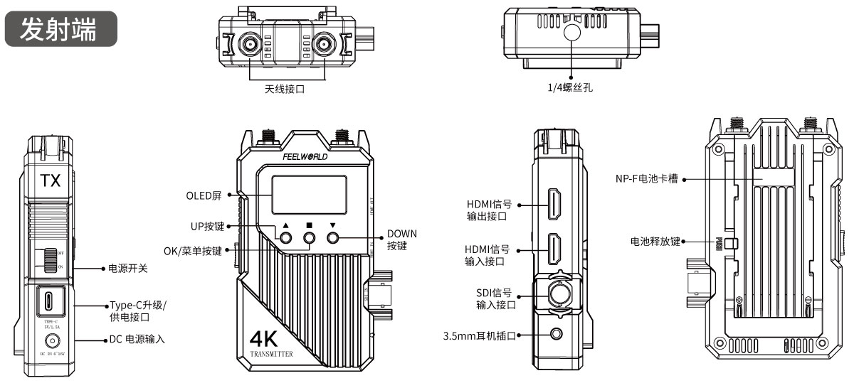 1 * SDI输入 2* HDMI输出 2 *天线接口 (RP-SMA公头) DC电源输入 3.5mm耳机孔 Type-C |