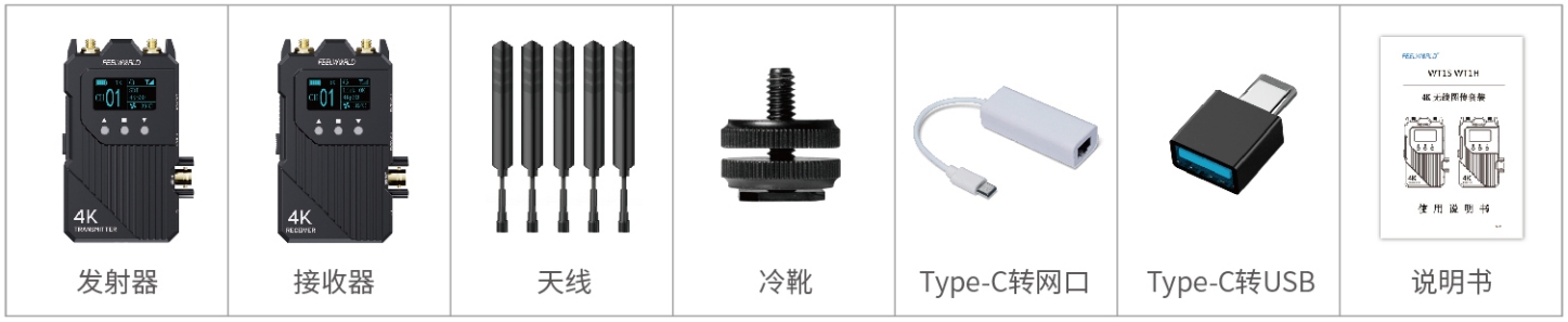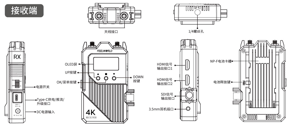 1 * SDI 输入 1 * HDMI 输入 1* HDMI output 2 *天线接口 (RP-SMA 公头) DC电源输入 3.5mm 耳机孔 Type-C |