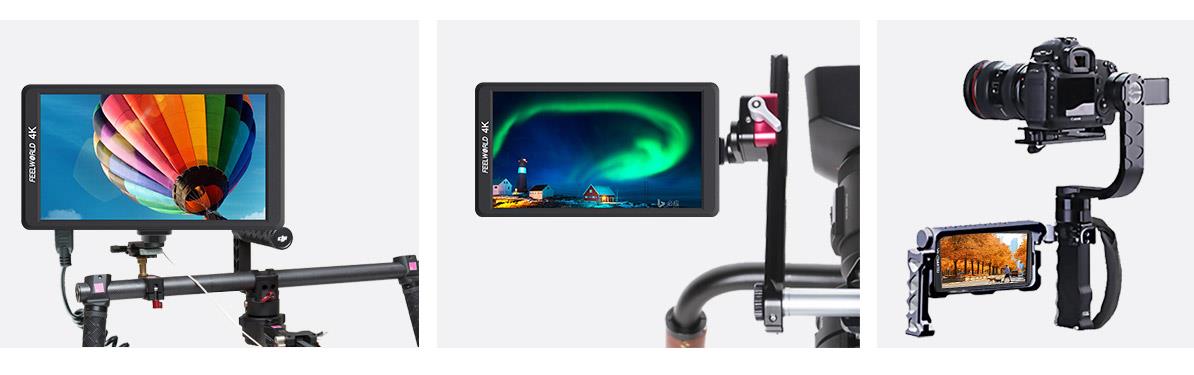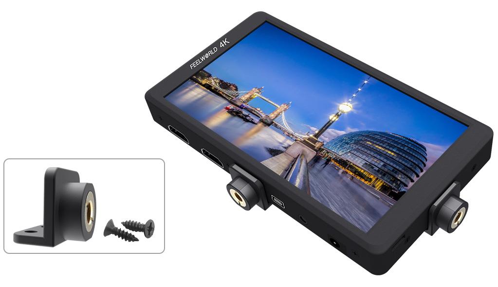 FEELWFEELWORLD F570设有标准1/4英寸安装孔让您可以轻松完成各类安装,您不仅可以安装到手持稳定器上使用,也可使用其自带的活动支架置于桌面,还可以牢固地将其安装在摄影机顶部作为绝佳的HD寻像器使用!如果把它安装在设备的底部时,还可以结合图像翻转功能,保持正确的画面显示方向!