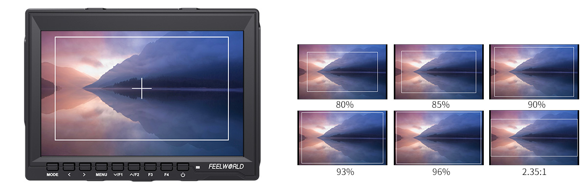 防止播放时扫描溢出, 导致不该被切的画面而被切掉。FEELWORLD监视器设有多种画幅安全框标记(80%, 85%, 90%, 93%, 96%, 2.35:1) 和拍摄标记线和十字中心线。保障稳定可靠的拍摄高效进行,满足多样化的后期裁剪需求。用户可以根据不同拍摄背景色调灵活选择标记线颜色(红色, 绿色, 蓝色, 白色, 黑色)